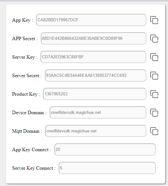 | Server Key | String | 服务器连接MQTT需要的KEY。Server Key允许使用通配符订阅 |